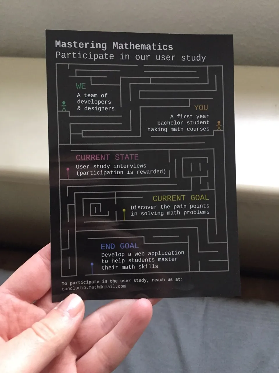 We targeted first year bachelor students who had math courses in their curriculum, i.e. anyone between “math sucks, but I have to do it” and “math rocks and I need more”.